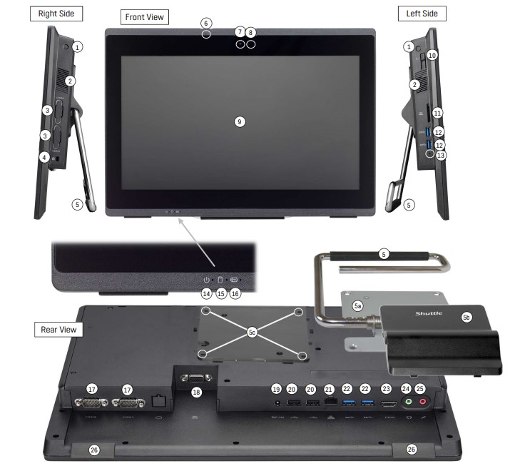 Rad počítačov typu „all in one“ od spoločnosti Shuttle zatiaľ zahŕňa modely s tromi rôznymi veľkosťami obrazovky: 11,6“, 15,6“ a 19,5“. Model série P52U s kapacitnou 15,6-palcovou multidotykovou obrazovkou ponúka rozlíšenie Full HD. Procesor Intel Ultra-Low-Voltage (ULV) zabezpečuje vysoký výpočtový výkon a zároveň udržiava nízku spotrebu energie. Vďaka pasívnemu chladeniu je systém prakticky nehlučný, bezúdržbový a schválený pre nepretržitú prevádzku 24 hodín denne, 7 dní v týždni. Obzvlášť vhodné pre vertikálne aplikácie je usporiadanie konektorov v spodnej časti a predný panel s krytím IP54, ktorý je chránený pred prachom a striekajúcou vodou.